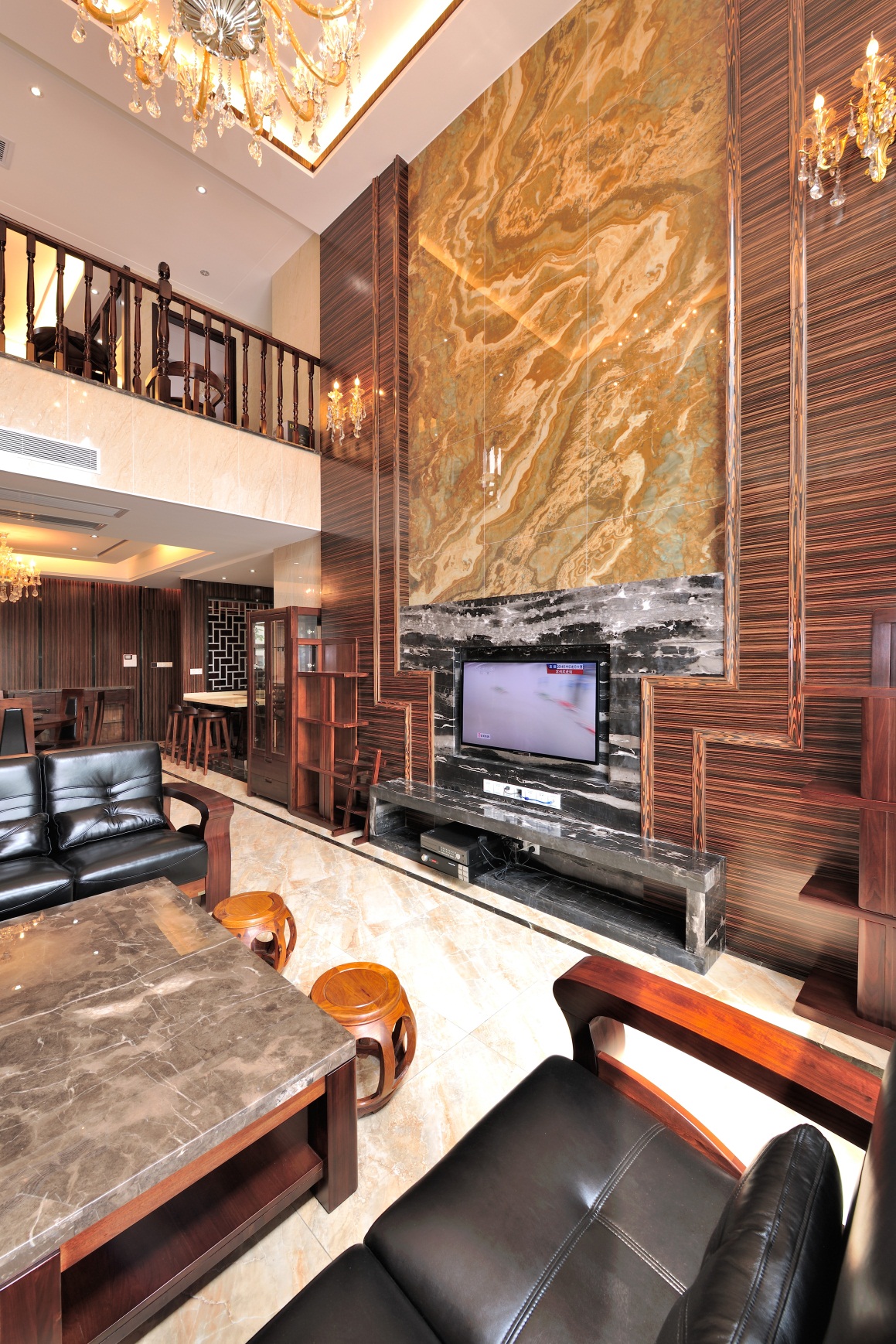 黑鏡鋼、黑金花大理石、烤漆飾面、墻紙、全拋釉地磚、布藝硬包